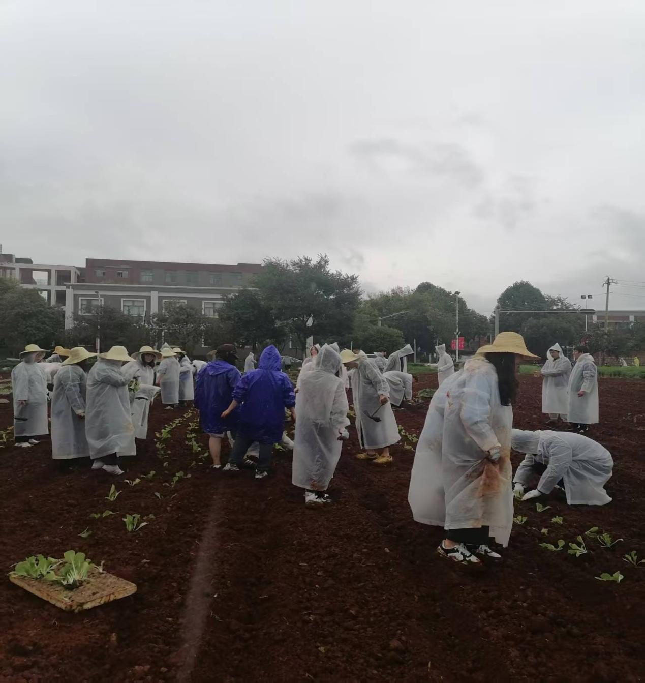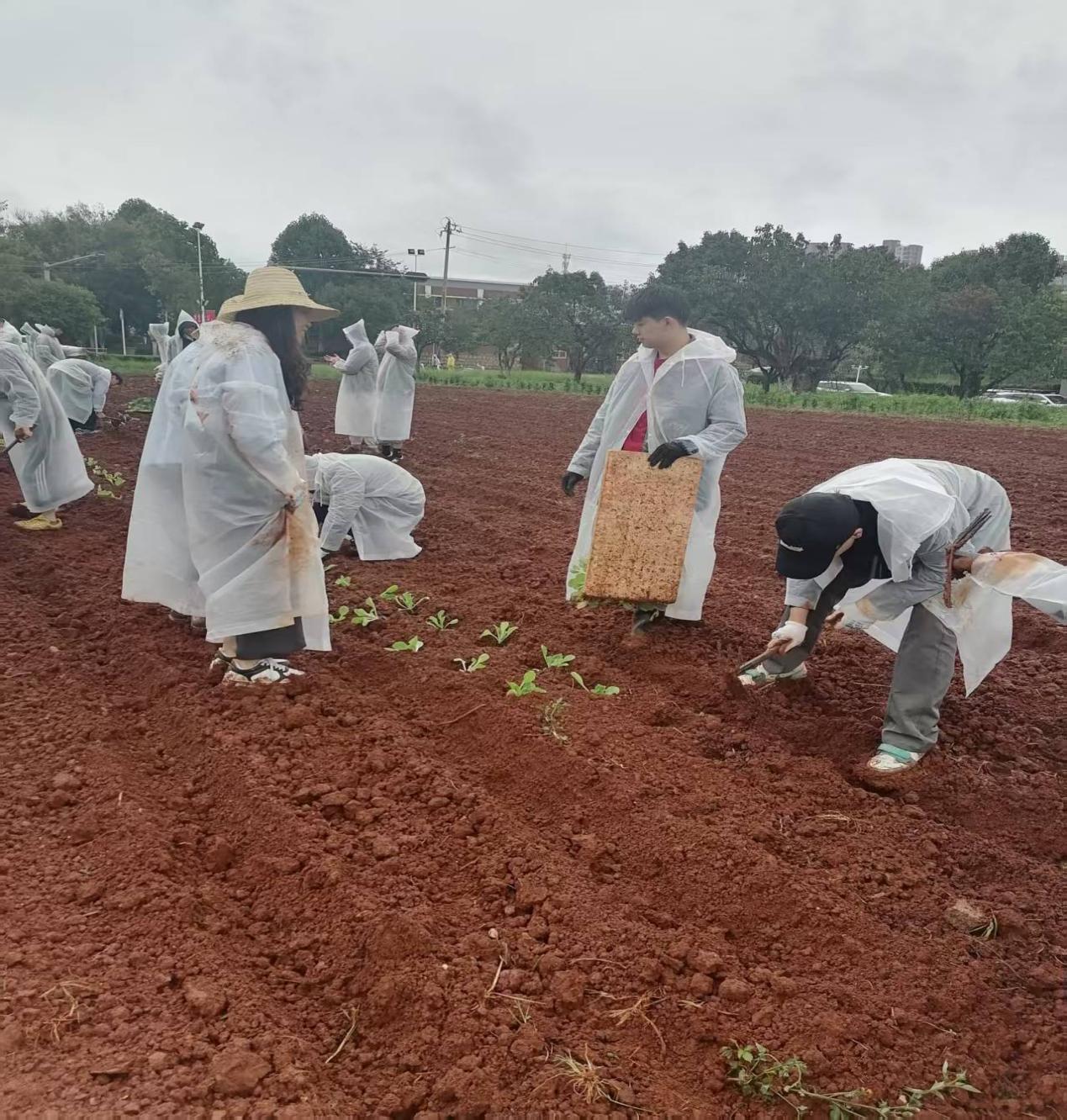 秋雨绵绵,红土新垦。活动伊始,现代农业工程学院研究生党支部的党员和技术骨干们充分发挥专业优势,化身“田间技术指导员”,为国际学院的师生党员和入党积极分子们详细讲解了蔬菜苗的种植技巧、间距要求、铺膜要领及后续养护知识。他们专业讲解和娴熟的示范,不仅传递了农业知识,更展现了学生党员服务群众、带头实践的风采,迅速打消了国际学院师生们初次下田的紧张与生疏。
