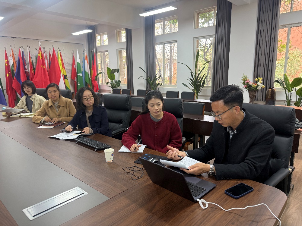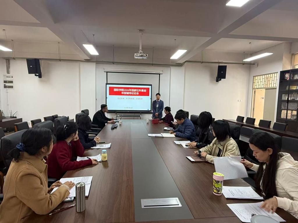 2026年3月18日,国际学院召开2026年国家社科基金项目申报论证会,邀请云南省社会科学院民族文学研究所所长王俊研究员、云南民族大学文学院乔立智教授,为学院教师进行“一对一”申报辅导。会议由国际学院院长杨朝均主持,国际学院社科基金申报专员、科研秘书参加会议。
